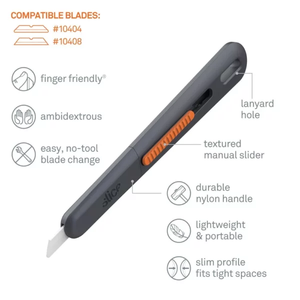The Slice® 10476 Manual Slim Pen Cutter uses the same finger-friendly® blade as our original pen cutters, offering the same safety benefits. Slice’s proprietary grind—applied to advanced ceramics—creates a unique edge that’s safe to the touch and lasts up to 11 times longer than comparable metal blades. The slim handle style allows maneuverability in tight spaces and features a side slider for easier manipulation with the thumb. As with all Slice tools, the 10476 can be used ambidextrously: just flip the blade edge in the housing to configure the tool for left-handed use. Made from durable glass-filled nylon, the Manual Slim Pen Cutter offers two different cutting depths to suit a variety of cutting tasks.